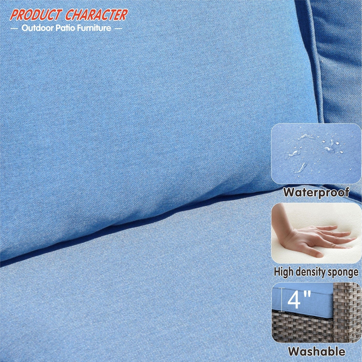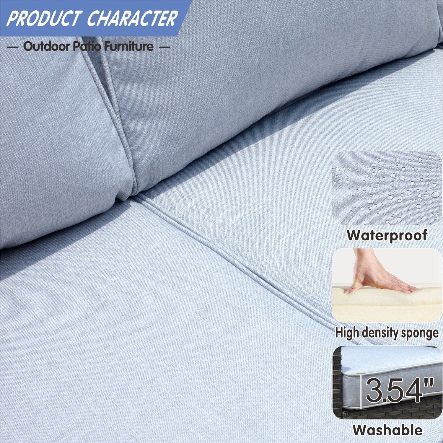 - Résistant à l'eau et aux intempéries : Les coussins et le mobilier sont conçus pour résister à l'eau, ce qui les rend parfaits pour résister à une pluie légère ou à la neige. Bien que cet ensemble résiste facilement à la plupart des conditions météorologiques, il est préférable de le protéger des intempéries extrêmes pour une meilleure longévité.